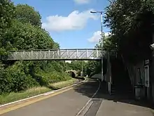Montpelier railway station is located in the Bristol ward of Ashley, north of the city centre, serving the districts of Montpelier, Cotham, Ashley Down and St Andrews. The surrounding area is mostly residential, with shops on the nearby A38 Cheltenham Road.[1] The station can be accessed step-free from Station Road to the south, or by a footbridge and steps from Cromwell Road to the north.[2] The station is on the Severn Beach Line from Bristol Temple Meads to Severn Beach, 2 miles 68 chains (4.6 km)[note 1] from Bristol Temple Meads, and 10 miles 55 chains (17.2 km) from Severn Beach.[3][4][5] It is the third station from Temple Meads, and first station of the branch part of the line (the first two stations, Lawrence Hill and Stapleton Road, are on the main line Cross Country Route).[6] The station is on a roughly east–west alignment, curving to the north, with a single 144-yard-long (132 m) curved platform to the south of the track, serving trains in both directions. Directly to the east of the station is the 268-yard-long (245 m) Montpelier Tunnel, and to the west is The Arches bridge over the A38.[7] The station's northern platform was abandoned in 1970 and is overgrown.[8]