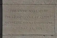 The ceremonial laying of the cornerstone took place on June 22, 1929, with thirty-six lodges and 2,000 Masons parading to the new temple from the Dorchester Street Temple. The Grand Lodge of Quebec met for the first time in the new temple on February 12, 1930, at its 60th Annual Communication, on February 12, 1930. The temple commemorates Masons who died in the First and Second World Wars and the Korean War.[4]
