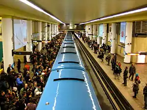 The Montreal Metro is Canada's second busiest rapid transit system and North America's fourth busiest rapid transit system, behind the New York City Subway, the Mexico City Metro and the Toronto subway, delivering an average of 937,700 daily unlinked passenger trips per weekday as of the fourth quarter of 2022.[8] In 2022, 245,514,900 trips on the Metro were completed. According to the STM, the Metro system had transported over 7 billion passengers as of 2010. With the Metro and the REM, Montreal has built one of North America's largest urban rapid transit schemes, attracting the second-highest ridership per capita behind New York City.[9] The Montreal Metro is currently voiced by actress Michèle Deslauriers, who announces the name of each station and service disruptions or delays.[10]