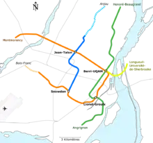 In December 2011, the AMT proposed its "Vision 2020" plan expanding the Line 5 (Blue) towards the borough of Anjou and Line 2 (Orange) towards Bois-Franc train station.[34] On September 20, 2013, the Société de transport de Montréal (STM) and provincial government announced the extension of the Line 5 east as far as Anjou with five new stations. After the Parti Québécois lost the 2014 provincial election, the future of the Blue Line extension came into question. The successor Liberal government had expressed interest in extending mass transit to the Airport and implementing a light rail line on the new Champlain Bridge under construction. The project could cost up to $3 billion based on a February 2016 reassessment.[35] Because of funding for infrastructure promised by the federal government in 2015, the Blue Line project remains a priority, according to Quebec and the STM.[36] In April 2018, the successor Liberal government, along with the Federal government, announced firm plans for the Anjou extension.[37] Construction on the Blue Line extension was slated to begin in 2021, with a completion date in 2026;[38] however, ballooning costs and delays put the project on hold. In 2021, it was reported land expropriations had increased the estimated cost over $6 billion and would push its completion date to 2028 or later, temporarily putting the project's future in doubt.[39]