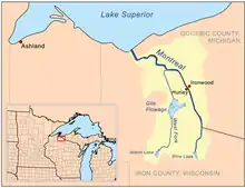 The Montreal River is a river flowing to Lake Superior in northern Wisconsin and the Upper Peninsula of Michigan in the United States. It is 47.8 miles (76.9 km) long[3] and drains approximately 270 square miles (700 km2) in a forested region. For most of its length, the river's course defines a portion of the Wisconsin–Michigan border. The Ojibwe name for the river is Gaa-waasijiwaang, meaning "where there is whitewater".[5][6]