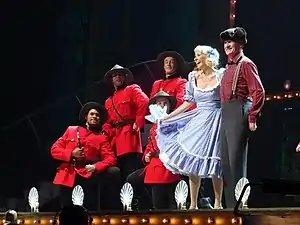 The Pythons used the British tradition of cross-dressing comedy by donning frocks and makeup and playing female roles themselves while speaking in falsetto.[41] Jones specialised in playing the working-class housewife, or "ratbag old women" as termed by the BBC.[26] Palin and Idle generally played the role more posh, with Idle playing more feminine women.[26] Cleese played female roles more sparsely, while Chapman was frequently paired with Jones as a ratbag woman or with Idle portraying middle-class women commenting upon TV. Generally speaking, female roles were played by women only when the scene specifically required that the character be sexually attractive (although sometimes they used Idle for this). The troupe later turned to Carol Cleveland—often described as the unofficial seventh member—who co-starred in numerous episodes after 1970.[42] In some episodes, and later in the stoning scene in Monty Python's Life of Brian, they took the idea one step further by playing women who impersonated men.[43]