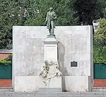 A detached limestone wall dedicated to Bravo Murillo and funded by the Association of Plumbing Employers of Madrid (ASEFOSAM) was erected later behind the statue.[6]