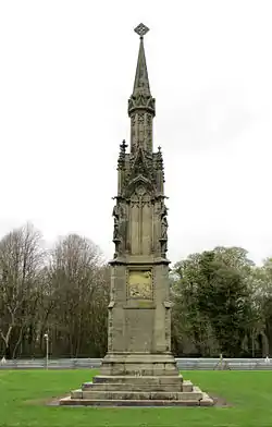 The monument is in Gothic style, and is in the form of an Eleanor cross.[3][lower-alpha 1] It is constructed in yellow sandstone, and consists of an Eleanor cross about 9.6 metres (31 ft) high standing on steps 0.8 metres (2.6 ft) high.[1] The cross stands on five square steps, and consists of a square base in two stages, an octagonal turret, and an octagonal spire surmounted by a cross. The lower stage of the base is relatively plain and has diagonal buttresses. On the south face is decoration in diapering above which is a panel carved in relief. The carving is badly weathered and its subject appears to depict a house and classical figures. On the sides of the memorial are blank panels, and on the north face is an inscribed bronze plaque. The upper stage of the base is narrower, and also has diagonal buttresses; these have canopied niches containing statues of female figures in medieval dress. Above the niches the buttresses rise to crocketed pinnacles with gargoyles. The faces between them contain tracery and above are crocketed gables. The octagonal turret is decorated with blank tracery, and at its top is a cornice with gables. The turret is surmounted by the spire.[5]