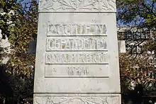 It was installed as a pair to Karađorđe's monument, unveiled a year before, at the end of the main path banked with the busts of important Serbs. In this way Obradović was brought in direct parallel with the leader of the First Serbian Uprising. The sculpture was placed on a high rectangular plinth on whose front side was carved the following inscription: “To Dositej Obradović, from Grateful Serbian People”, and on the reverse the writer`s motto taken from the Letter to Haralampije:[6] "I will write for the mind, heart and character of the people, for brothers Serbs whatever their law or religion." Obradović is represented in movement, with a hat, books and a stick in his hand, while at the bottom of the plinth there is an inscription of his own words: “He learns walking, looking into the future!”