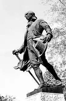 The monument was built as a result of the initiative of the Serbian Literary Cooperative[2] and Јоvan Skerlić, an admirer of Obradović. After some preliminary discussions for the monument, formal plans were made to construct the monument for the 100 year anniversary of Obradović's death in 1911. The Committee for the Celebration was formed, led by Stojan Novaković and Jovan Skerlić, to plan for a series of festivities and the construction of the monument. The project was supported by the Municipality of Belgrade that provided funding and conducted a competition for Yugoslav artists to design the monument of a full-sized figure of Obradović.[3][lower-alpha 1] Rudolf Valdec was the artist selected from the competition. In an article on the occasion of presentation of the models received for the competition, the magazine New Spark said about the Valdec's design: “Dositej was conceived as a traveller, boldly moved forward by some supernatural power, which was awakened in him. His eyes were directed to the lofty target, to which his feet should carry him. Books under his arm and pen in his hand show his noble mission. It is felt that the way, which he clears before him, goes to the glory and eternity.”