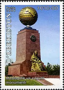 The Monument to the Independence of Uzbekistan is a Tashkent monument made in honor of the independence of Uzbekistan. At the top of the monument is a metal sphere ornamented with an ornamental pattern, on which a map of Uzbekistan is depicted. Wreath-laying ceremonies are regularly held at the pedestal of the monument on national holidays and state visits.