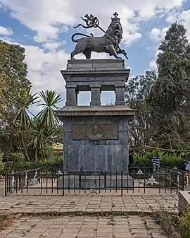 The monument is located in the square of the Addis Ababa railway station in Addis Ababa and marks the end of Winston Churchill Avenue, one of the main arteries of the city.[3] The sculpture of the Lion of Judah, in gilded bronze, is placed on a black granite pedestal decorated with relief portraits of emperors Menelik II and Haile Selassie, Empress Zewditu, and Ras Makonnen Wolde Mikael. The work was made by the French sculptor Georges Gardet in 1930, on the occasion of the coronation of Emperor Haile Selassie on 2 November 1930. After the 1974 revolution, the Derg regime thought of removing the monument, symbol of the monarchy, but an association of Arbegnoch veterans claimed that it was a memory of Ethiopian antifascist resistance and a symbol of Ethiopia. Therefore, the regime agreed to leave the monument, which is still in front of the Addis Ababa central station.[4] In 1954, a new monument was commissioned by Emperor Haile Selassie from sculptor Maurice Calka.[5]