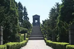 There is also a deeper symbolism of the complex. The monument is placed on the five-step pyramid, which symbolizes five centuries of Ottoman occupation of Serbia. Caryatids actually represent mothers of the fallen soldiers, who are keeping the peace and sanctity of the burial place. The monument is also one of the rare such venues which is located outside of the town center. King Alexander wanted to transform the top of the Avala into the replica of the Kajmakčalan mountain which gained almost mythical importance after the 1916 Battle of Kaymakchalan between Serbia and Bulgaria, and was euphemistically called "Gate of the Homeland" or the "Altar of the Motherland". The monument was to represent the relocated commemorative chapel from Kajmakčalan and even plants which grow on that mountain, or resemble it, were planted around the monument. During the 1934–1938 period when the monument was built, the surrounding area was also forested with the specific species of conifers. They were specifically ordered from the botanical garden in Munich, Germany. A certain number of trees was donated to Yugoslavia personally by Adolf Hitler.[11]