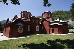 Saint Archangels Monastery is a Serbian Orthodox monastery, founded by the Serbian Emperor Stefan Dušan between 1343 and 1352 on the site of an earlier church, and it is located near the Bistrica river in Prizren. At the time when it was constructed, the building contained a monastery and two small churches.[3] A really important feature to be mentioned is that Stephen Uroš IV Dušan of Serbia and Balša I were buried in this monastery. It is declared a Monument of Culture of Exceptional Importance in 1948 by Republic of Serbia, under status number "СК 1366".[22] Today it is a protected monument of Republic of Kosovo, under the status number "464/48".[15] It presents a very important archaeological site and photography is forbidden.[23][24]