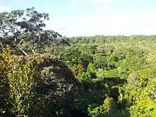 The main natural area is located several kilometres further down the road, past the visitors centre. Here, several looped trails go through kilometres of gradually recovering indigenous forest, and past a large elevated platform at the park's highest point, from which the surrounding region can be viewed.[4]