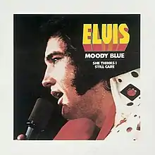 "Moody Blue" was Presley's last No. 1 hit in his lifetime, topping the Billboard magazine Hot Country Singles chart in February 1977.[3] "Moody Blue" also peaked at number thirty-one on the Hot 100.[4] RCA Records also issued an extremely limited quantity of the "Moody Blue" single in an experimental translucent blue vinyl pressing, with "She Thinks I Still Care" as the B-side. Six months after "Moody Blue" topped the chart, Presley was dead.