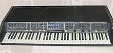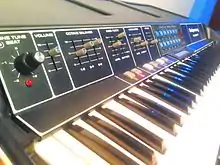 The Polymoog Keyboard 280a is a stripped-down version of the original 1975 Polymoog. The two are similar in appearance, sharing the same case and keyboard. The right-hand control panel is absent, while the left-hand panel has only a few sliders, giving the user less control over the sounds. The Polymoog Keyboard features more presets than its predecessor: "vox humana", "string 1", "string 2", "electric piano", "piano", "honky tonky", "clav", "harpsi", "brass", "chorus brass", "pipe organ", "rock organ", "vibes", and "funk". Control over these presets is limited to octave balance, envelope attack, and LFO modulation depth and rate. The lower two octaves may also be split off to play a separate bass tone, with some control over this tone allowed via a dedicated bass filter. Filter control of the main preset sounds is not user adjustable other than via an external controller.[6] The Polymoog Keyboard was less expensive than its predecessor, being priced at $3995 in 1979.[1] The best known of the presets on the Polymoog Keyboard is "Vox Humana", which was not present on the original Polymoog. This preset forms the basis of the electronic string sound in the work of Gary Numan.[7][8]