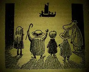 The morning after the party, Fillyjonk organises the cleaning of the house, though it soon begins to snow, and she decides to leave, finally on good terms with the Hemulen. Meanwhile, Grandpa-Grumble comes to the conclusion that the winter ages people and so decides to go into hibernation in the clothes cupboard like the Ancestor.[10] The treehouse that the Hemulen was building collapses, and so instead Snufkin takes him sailing in his boat, though the Hemulen realises that he gets sea-sick, and after the trip leaves to go home.[11]