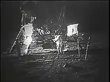 - Cameras on the Lunar Module did. The Apollo TV camera mounted in the Modularized Equipment Stowage Assembly (MESA) of the Apollo Lunar Module gave a view from the exterior. While still on the Module's ladder steps, Armstrong deployed the MESA from the side of the Lunar Module, unpacking, amongst other things, the TV camera. The TV camera was then powered on and a signal transmitted back to Earth. This meant that upwards of 600 million people on Earth could watch the live feed with only a very slight delay. Similar technology was also used on subsequent Apollo missions.[79][80][81][82] It was also filmed from an automatic 16mm movie camera mounted in a window of the Lunar Module.