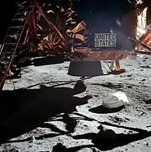 Much third-party evidence for the landings exists, and detailed rebuttals to the hoax claims have been made.[1] Since the late 2000s, high-definition photos taken by the Lunar Reconnaissance Orbiter (LRO) of the Apollo landing sites have captured the Lunar Module descent stages and the tracks left by the astronauts.[2][3] In 2012, images were released showing five of the six Apollo missions' American flags erected on the Moon still standing. The exception is that of Apollo 11, which has lain on the lunar surface since being blown over by the Lunar Module Ascent Propulsion System.[4][5]