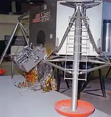 - No crater should be expected. The 4,500 kg (10,000 lb) thrust Descent Propulsion System was throttled very far down during the final landing.[100] The Lunar Module was no longer quickly decelerating, so the descent engine only had to support the lander's own weight, which was lessened by the Moon's gravity and by the near exhaustion of the descent propellants. At landing, the engine thrust divided by the nozzle exit area is only about 10 kPa (1.5 psi).[101][102]