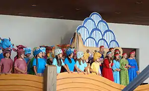 Professor Laura Shakelford observed how Suzy as the raven in Noye's Fludde is followed by a historic rainstorm echoing Noah's flood.[39] Scholar Anton Karl Kozlovic suggested that while the film includes no quotes from the Book of Genesis and no shots of a copy of the Book, Noah's story is used for symbolism. The children dress as animals before floods cause them to seek shelter in the church, Kozlovic observed.[40] Following the Genesis narrative, after the New Penzance flood, there is "abundant regeneration" with great harvests of high-quality produce.[41] Shakelford read the story as a commentary on the characters grappling with the relationship between "the material world" in "postmodern cultures" and that of animals.[39]