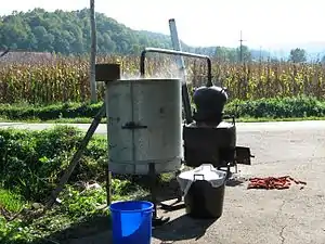 Moonshining has always been popular in the southeastern part of the United States, especially in farm communities, partly because farmers have the produce (corn, barley, apples, grapes, etc.) to make illegal liquor. In some cases, farmers use produce they cannot sell to make moonshine for a profit.[38] Lengthy prison sentences for those caught manufacturing or distributing illegal alcohol makes moonshiners conceal their still sites in secret locations. Stills are unique contraptions that typically consist of several metal drums, copper pipes, and heat sources that heat the mash of sugar, starch and fruit or grain product. The weight and overall size of stills makes concealment difficult.[39] This has led many moonshiners to hide their still sites in very clever locations; most of these moonshiners take refuge deep in the backwoods of America, in abandoned barns in addition to underground structures and tunnels. A classic example of underground still sites that are still being utilized today is the usage of old abandoned mining tunnels.[40] This idea is said to have started in the old mining caves in Tennessee soon after the civil war. Illegal distillers would use these caves because it provided adequate cover that protected them from being discovered by law enforcement officers. American moonshiners also preferred the use of caves due to the natural abundance of water that the caves provided; which is a key ingredient of moonshine. These caves were used to manufacture moonshine until well into the 20th century.[41]