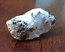 The most common moonstone is of the orthoclase feldspar mineral adularia, named for an early mining site near Mt. Adular in Switzerland, now the town of St. Gotthard.[1] A solid solution of the plagioclase feldspar oligoclase +/− the potassium feldspar orthoclase also produces moonstone specimens.
