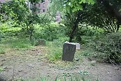 The Moore-Jackson Cemetery was then neglected and treated as a dump, as noted in a 1931 New York Times article.[22] It was not until 1935 that Works Progress Administration workers, hired to clear weeds from the site, rediscovered the cemetery.[9][15] The next year, the burial plot was restored and the surviving tombstones were rearranged.[23][24] All of the remaining tombstones were placed on a section of the cemetery, measuring 40 by 50 feet (12 by 15 m), near the eastern part of the site.[3][25] The corpses were not moved, which resulted in some of the corpses being unmarked and some tombstones being placed atop nothing.[24] The land was raised to the height of the surrounding streets and a concrete-post fence was erected around the plot.[15][22]