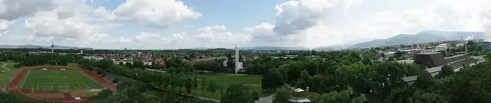 Mooswald is a district in the western part of Freiburg im Breisgau, which consists of the two districts Mooswald West (521) and Mooswald East (522). Its population is 9,223 (2020).[1] In the North East, Mooswald borders the district of Brühl, with its airfield, the university campus of the technical faculty and the exhibition centre. Mooswald further borders the district of Landwasser in the North West, the district of Stühlinger in the East and the district of Betzenhausen with the Seepark in the South West. Mooswald is separated from Brühl by the Breisgau S-Bahn, from Landwasser by the Westrandstraße (Paduaallee/Mooswaldallee) and from Stühlinger by the railway tracks of the freight railway.