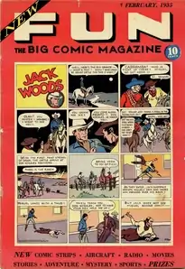In the latter half of 1934, having seen the emergence of Famous Funnies and other oversize magazines reprinting comic strips, Major Malcolm Wheeler-Nicholson founded National Allied Publications and published New Fun #1 on January 11, 1935[3] (cover-dated February 1935). A tabloid-sized, 10-inch by 15-inch, 36-page magazine with a card-stock, non-glossy cover, it was an anthology of humor features, such as the talking animal comic "Pelion and Ossa" and the college-set "Jigger and Ginger", mixed with such dramatic fare as the Western strip "Jack Woods" and the "yellow peril" adventure "Barry O'Neill", featuring a Fu Manchu-styled villain, Fang Gow.[1] The first issue also featured humor strip "Caveman Capers", an adaptation of the 1819 novel Ivanhoe, spy drama "Sandra of the Secret Service", and a strip based on an early Walt Disney creation Oswald the Lucky Rabbit.[2]