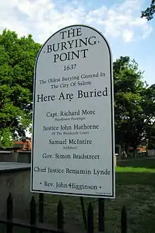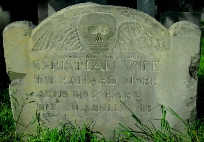 Richard More is buried in Salem. There is documentary evidence that he was alive in 1694 and dead in 1696.[65] His gravestone gives an age of 84, but he deposed in 1684 that he was aged seaventy yeares or thereabouts indicating he was unsure of his birth date. The gravestone in the old Salem burial ground gives a date of 1692.[29]