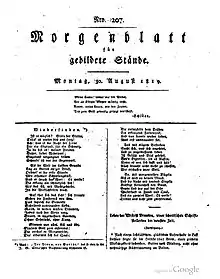 The Morgenblatt für gebildete Stände ("Morning paper for the educated classes", renamed to Morgenblatt für gebildete Leser, "Morning paper for educated readers" in 1837) was a German cultural and literary journal that existed from 1807 to 1865. It appeared daily (Monday to Saturday) until 1851, when it was changed to a weekly journal. The Morgenblatt was published by Cotta in Tübingen and later in Stuttgart, and was the most important German literary and cultural journal of its time.[1][2]
