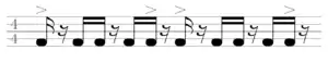 The melodic line of the morna varies a lot through the song,[3] with ascending and descending note sequences, and within a bar the notes generally do not have the same length. One frequent characteristic of the morna is the syncopation, more precisely, one note at the end of a bar is extended to the strong beat of the next bar. The melody is accentuated on the first beat and the last half-beat of the bar.