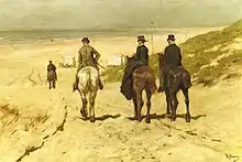 Mauve was a member of the Hague School, which was known for its portrayal of the harsh existence of fishermen in Scheveningen. Here, however, Mauve chose a different subject in depicting a bourgeois group riding along the beach. The painting shows a group of riders descending to the beach, with bathing cabins ready for swimmers. The riding horses are unusual for a Mauve piece, as he was known for painting animals in their natural environment and was particularly famous for his landscapes with sheep.[1] Mauve chose a particular color scheme of blue and yellow, which is effective in depicting the seaside atmosphere.[2] The movement of light in the painting suggests a high amount of dynamism and motion.