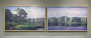 Morning on the White River is a 2013 oil on linen canvas landscape diptych by artist Mason Archie, which depicts a view of the White River from a location approximately ¼ mile from Sidney & Lois Eskenazi Hospital.[1] Archie selected this specific location along the river to paint when he encountered human traces left behind there.[1] Makeshift fishing props and a worn path serve as evidence of the frequency with which local residents visit, and these details can be seen within the paintings:[1] Each of the two paintings measure 38.25" x 61.5", framed.