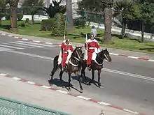 The Moroccan Royal Guard (Arabic: الحرس الملكي المغربي, French: Garde royale marocaine, Spanish: Guardia Real Marroquí) is officially part of the Royal Moroccan Army. However it is under the direct operational control of the Royal Military Household of His Majesty the King. The sole duty of the guard is to provide for the security and safety of the King and royal family of Morocco.
