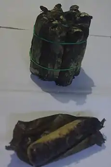 After the mixture cools, banana leaves are prepared and cut to be used as wrappers.[2] The recommended amount is two tablespoons of the mixture per banana leaf.[2][4] The moron is then brushed with butter.[2] After wrapping, both ends of the banana leaf are tied with string.[2] Lastly, the moron are steamed for about half an hour.[2][4] After the moron is cooled, it can now be served.[2]