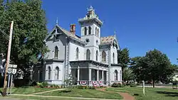 Constructed in 1875,[1] the Sharp House is a brick building with a stone foundation, a slate roof, and elements of wood and stone.[5] Two stories tall, the house is a clear example of the Italianate style. Its design comprises two wings that join at the base of a tower at the house's enter;[3] the interior is divided into fourteen rooms, including one on the third story of the tower, which can be reached by ascending a spiral staircase.[6] With its tower, the house is one of the city's tallest buildings; the only ones that surpass it are the courthouse and St. Colman's Catholic Church. Its prominence is further enhanced by its location at a major intersection; Washington and Columbus Avenues at the house. A grand design was Sharp's goal upon the house's construction; he reportedly claimed that he hoped for a house that would be "the showplace of Washington Court House".[7]