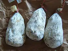 Mortadella di Campotosto (popularly called mule balls) is a salami produced in limited quantities in the territory of the municipality of Campotosto in the province of Abruzzo.[1][2][3] Mortadella di Campotosto it is listed as a traditional Italian food product (P.A.T.) by the Ministry of Agricultural, Food and Forestry Policies.[4]