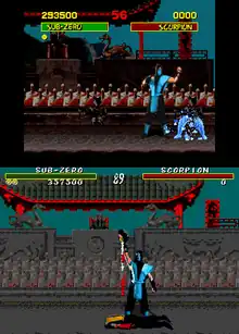 Boon later said, "since the beginning, one of the things that's separated us from other fighting games is the crazy moves we've put in it, like fireballs and all the magic moves, so to speak."[19] According to Tobias, the game's ultraviolent content had not been originally intended and was only implemented gradually as the development progressed.[20] The concept of Fatalities in particular evolved from the "dizzied" mechanic in earlier fighting games. Boon said that he hated the "dizzied" mechanic, but that it was fun to have one's opponent get dizzied and get in a free hit. Boon and Tobias decided they could eliminate the aggravation of getting dizzied by having it occur at the end of the fight, after the outcome had already been decided.[21] An early version of the game used two more buttons for middle punch and kick attacks.[22]