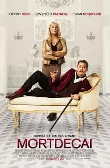 Mortdecai is a 2015 American action comedy film directed by David Koepp and written by Eric Aronson. The film is adapted from the novel series Mortdecai (specifically its 1972 first installment Don't Point that Thing at Me) written by Kyril Bonfiglioli. It stars Johnny Depp in the title role and features Gwyneth Paltrow, Ewan McGregor, Olivia Munn, Paul Bettany and Jeff Goldblum. Released by Lionsgate on January 23, 2015, Mortdecai was a box office flop, grossing $47.3 million against its estimated $60 million budget, and was critically panned.[4][5]
