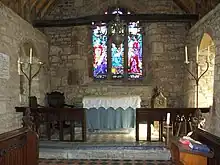 In spite of Victorian restorations there remain some pre-Reformation features including window openings and a piscina with a plain ogee head and a very shallow basin cut off in front dating probably from the 14th century.[10] The east wall may have been rebuilt and the west end of the nave extended in the 15th century, whilst the south porch, tiled roofs and bell-turret are of about 1600. The font is a plain octagonal stone, thickly colourwashed, with a moulding of the 13th century at the top and another at half height. It has a 16th-century flat wood cover with moulded cross-framing and pierced by two holes for the former staples.[1] The Chancel contains two memorials, on the South side one to the Holyoake family, landowners in the 18th century, whilst the one on the North side is to Thomas Walker, of Studley Castle, Lord of the Manor of Morton Bagot, who died in 1887.