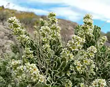 Mortonia is a small genus of flowering shrubs known as saddlebushes, sand paper bush or mortonias. These are rough, thorny, hairy shrubs with leathery leaves and panicles of fleshy white to purplish flowers. They bear nutlets containing 1 seed each. They are native to the southwestern United States and northern Mexico, where they are most abundant in dry regions.