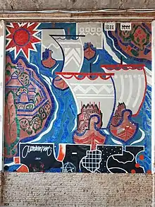 A mosaic is a panoramic, epic composition in spirit. Stark decoration is achieved due to the contrast of little pieces of shiny ceramic tiles, laid on the main compositional lines and contours, and matte colored cement background.[7]
