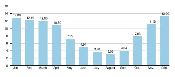 Average monthly flow rate of the Moselotte (m3/s) measured at Vagney hydrological station