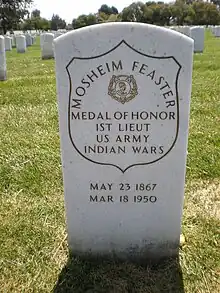 Mosheim Feaster was born in Schellsburg, Pennsylvania, on May 27, 1867, to Conrad and Mary Feaster.[1] He enlisted in Company E, 7th Cavalry Regiment, U.S. Army on October 23, 1889, in Cleveland, Ohio.[2][3] Assigned to frontier duty in the Dakota Territory, Feaster took part in campaigns against the Sioux during the late-1880s. His unit was ordered to bring in the Sioux chief Big Foot, on the morning of December 29, 1890, they surrounded his camp on the banks of Wounded Knee Creek. Although intending to place Big Foot under arrest and disarm his followers, fighting broke out resulting in what was then called the Battle of Wounded Knee. Feaster was cited for "extraordinary gallantry" during the battle by advancing to an exposed position and holding it under heavy fire. He was one of twenty soldiers who received the Medal of Honor for his actions.[3] Feaster was discharged as a private on June 22, 1893, at Fort Riley, Kansas.[2]