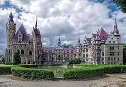 The Moszna Castle (Polish: Pałac w Mosznej, German: Schloss Moschen) is a historic castle and palace located in the small village of Moszna, in southwestern Poland. Situated approximately 30 kilometres (19 mi) south of the regional capital Opole, between the towns of Prudnik and Krapkowice, the residence is an excellent example of romantic fairy-tale and eclectic architecture.[1][2][3]