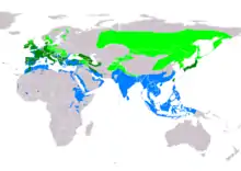 The bird is widely distributed across the Palearctic region with several well marked populations. The nominate form (includes caspica of Iran, Turkey and the Caucasus) is from western Europe including the British Isles, Scandinavia and Mediterranean region. Race melanope, which is not well separated from the nominate subspecies, is described as the population breeding in eastern Europe and central Asia mainly along the mountain chains of the Urals, Tien Shan and along the Himalayas.[8] They winter in Africa and Asia. Race robusta breeds along the northeastern parts of Asia in Siberia extending to Korea and Japan. These winter in Southeast Asia. Island forms include patriciae of the Azores, schmitzi of Madeira and canariensis of the Canary Islands.
