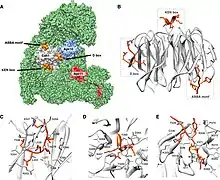 The KEN box is a sequence motif targeted by the APC with the consensus KENxxxN (K is lysine and E is glutamate).[2] This motif binds on the top surface of the WD40 domain of the APC activator subunit (Cdh1 or Cdc20) and forms an underwound helix with a tight turn in the pocket, which creates charged residues of the consensus to contact the binding pocket on the activator surface.[1]