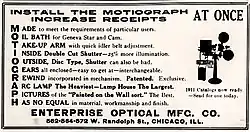 Motiograph (originally The Enterprise Optical Manufacturing Company) was a film equipment company established by Alvah C Roebuck in Chicago in 1896. The company manufactured theater projectors and speakers.[1][2][3] Their Optiograph 35 mm film projector was first introduced in 1898 and sold via catalogs including Sears. This was a smaller projector suitable for homes and schools. Beginning in 1908, all products released by the Enterprise Optical Manufacturing Company carry the brand name Motiograph. In 1911, their first theater grade 35 mm projector (Motiograph model D) was released. Roebuck sold the company in 1924 to a group of investors led by O.F. Spahr and Fred Matthews who would become the new President and Secretary, respectively. The Matthews family would retain ownership from then on. In 1936, they change the company name from the Enterprise Optical Manufacturing Company to become Motiograph, Inc.[4] Also in 1936, Motiograph releases the very popular model K projector and continues to innovate after the war years. The date of the company's closure is unverified, but by 1969 it had failed to renew any copyrights for its products.[5] The last corporate listing for Motiograph in Illinois is from 1973.