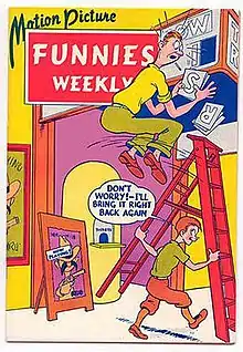 Motion Picture Funnies Weekly was produced by First Funnies, Inc., one of the 1930s–1940s Golden Age of comic books "packagers" that would create outsourced comics on demand for publishers. The company, founded by Centaur Publications art director Lloyd Jacquet and later named Funnies Inc., planned to be a publisher itself, with Motion Picture Funnies Weekly as its initial product.[1] While the postal indicia gives the publisher as First Funnies, Inc., the back cover, a house ad, directs interested parties to contact Funnies, Inc.[2]
