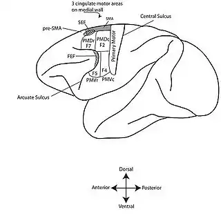 The premotor cortex is now generally divided into four sections.[11][12][13] First it is divided into an upper (or dorsal) premotor cortex and a lower (or ventral) premotor cortex. Each of these is further divided into a region more toward the front of the brain (rostral premotor cortex) and a region more toward the back (caudal premotor cortex). A set of acronyms are commonly used: PMDr (premotor dorsal, rostral), PMDc, PMVr, PMVc. Some researchers use a different terminology. Field 7 or F7 denotes PMDr; F2 = PMDc; F5=PMVr; F4=PMVc.
