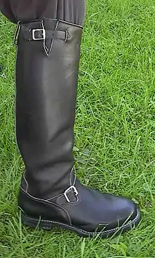Motorcycle police boots are designed specifically to be worn by motorcycle police officers. Very similar to riding boots, motorcycle police boots are typically knee-high (between 18 and 21 inches in height), the foot and shaft are made from black, smooth-grained, high-gloss leather and the low-heeled sole is made from hard rubber. The boots are typically form-fitting and intended to be worn over breeches or jodhpurs as part of the officer's uniform. The most notable manufacturers for boots to the UK police force are Goldtop (pre 1980s), and Alt-berg (post 1980s).